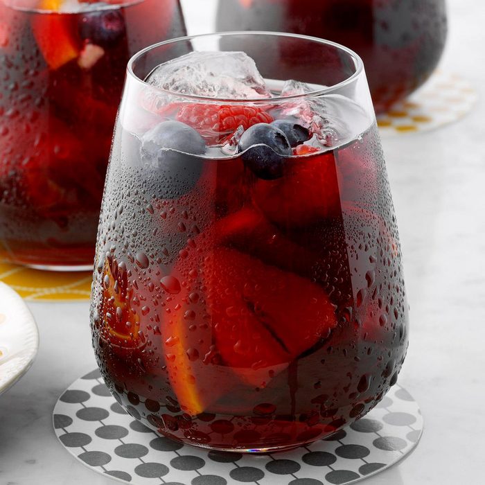 “Sangria is a Spanish drink of wine mixed with spices, cut fruit, and fruit juice, sherry or brandy. It’s best to mix this and let it sit for an hour or more before serving so all the flavors of the fruit and wine blend together.” —Taste of Home Test Kitchen