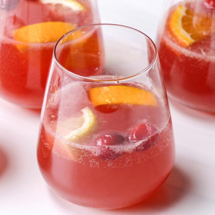 Sangria lovers will appreciate this fruit-powered mocktail. Apple cider and juice make the sparkling base. Orange juice, cranberry juice and matching garnishes turn it into a festive drink that resembles sparkling red wine sangria without the alcohol.