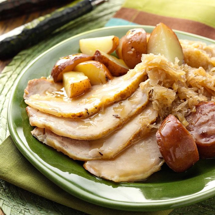 This recipe was adapted from one my mom used to make when I was growing up. It has all of our favorite "fall" flavors, such as apples, pork roast, sauerkraut and potatoes. I often coat the slow cooker insert with cooking spray to prevent the potatoes and meat from sticking.—Tonya Swain, Seville, Ohio
