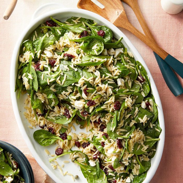 My daughter-in-law’s sister brought a salad to a family function, and I immediately fell in love with it. When I got home, I created my own version of what is now the cranberry orzo spinach salad. With its citrusy vinaigrette, briny capers, salty feta and sweet-tart dried cranberries, it’s the perfect combination of flavors. —Jennifer Nystrom, Pooler, Georgia