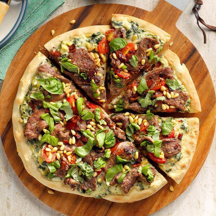 One of my first jobs was in a restaurant. This steakhouse pizza recipe gives me a chance to celebrate two of my favorite foods. I love the addition of eggs baked onto the pizza for a steak and eggs dish. —Lisa Benoit, Cookeville, Tennessee