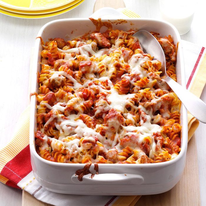 Kids will line up for this zippy pizza-flavored dish. The recipe makes two casseroles, so you can serve one to your family right away and keep the other in the freezer for another night. —Nancy Scarlett, Graham, North Carolina
