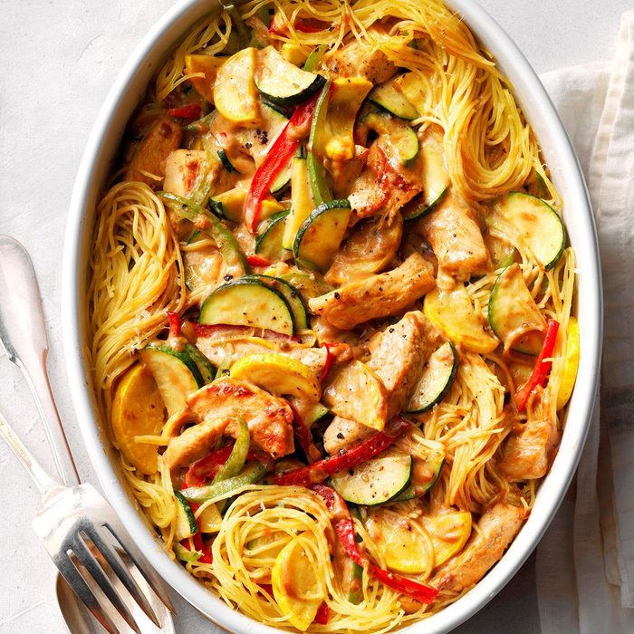 I’m always in the kitchen making dishes for my family, neighbors or the local fire department to try. My husband is a firefighter in our town, and this chicken spaghetti recipe is a favorite there. —Krista Davis-Keith, New Castle, Indiana