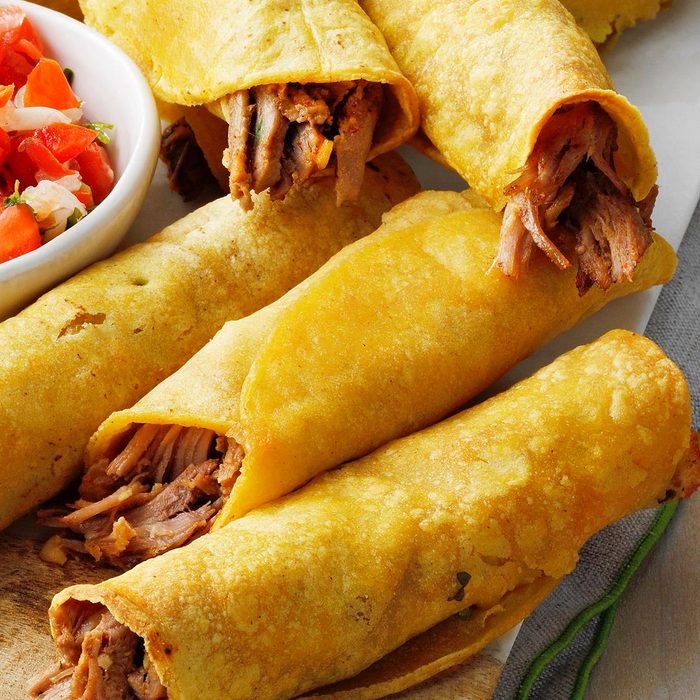 Taquitos are a popular appetizer and these homemade ones are so much better than the frozen ones in the supermarket. If you want a little more punch to the filling, adjust the seasonings to suit your taste.—Taste of Home Test Kitchen, Milwaukee, Wisconsin