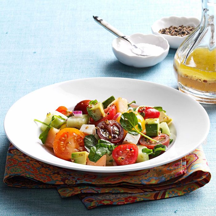 Watermelon and tomatoes may seem an unlikely pair, but they team up to make a winning combination in this eye-catching salad. —Matthew Denton, Seattle, Washington