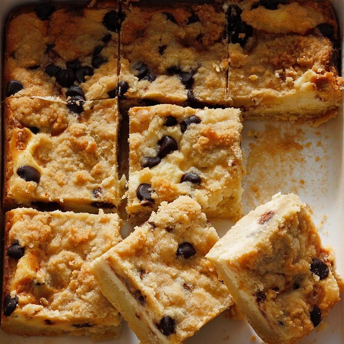 These cheesecake bars have four delectable layers: a buttery crust, a creamy cheesecake filling, chocolaty morsels and a crumbly topping. It’s sugar free—and guilt free. You’ll get nothing but compliments on this dessert. —Rachel Sanders, Salem, Ohio