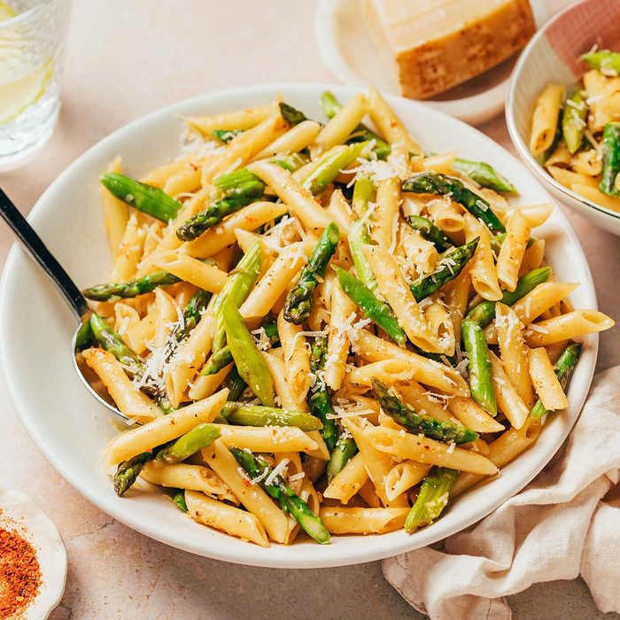 Many terrific recipes change hands at my ladies' bridge group's monthly get-togethers. That's where I discovered this zippy, tempting dish. The garlic, asparagus, Parmesan cheese and red pepper flakes create an irresistible taste combination. —Jean Fisher, Redlands, California