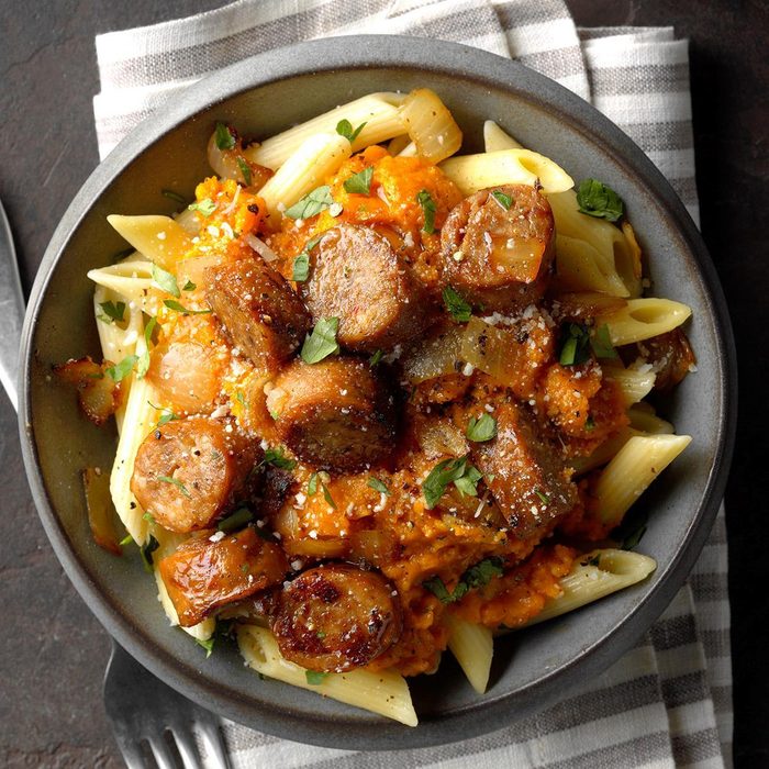 We punch up our pasta with smoked sausage and fire-roasted tomato sauce. It's an easy recipe to switch up—use whatever noodles and spaghetti sauce are in your pantry. —Jean Komlos, Plymouth, Michigan