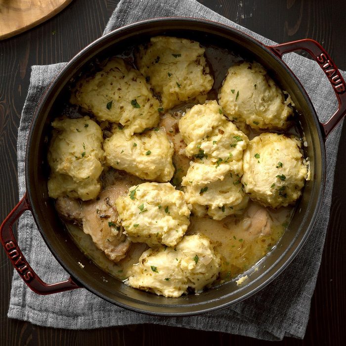 Homemade chicken and dumplings from scratch hearken back to my childhood and chilly days when we devoured those cute little balls of dough swimming in hot, rich broth. It's one of those types of soup you'll want to eat again and again. —Erika Monroe-Williams, Scottsdale, Arizona