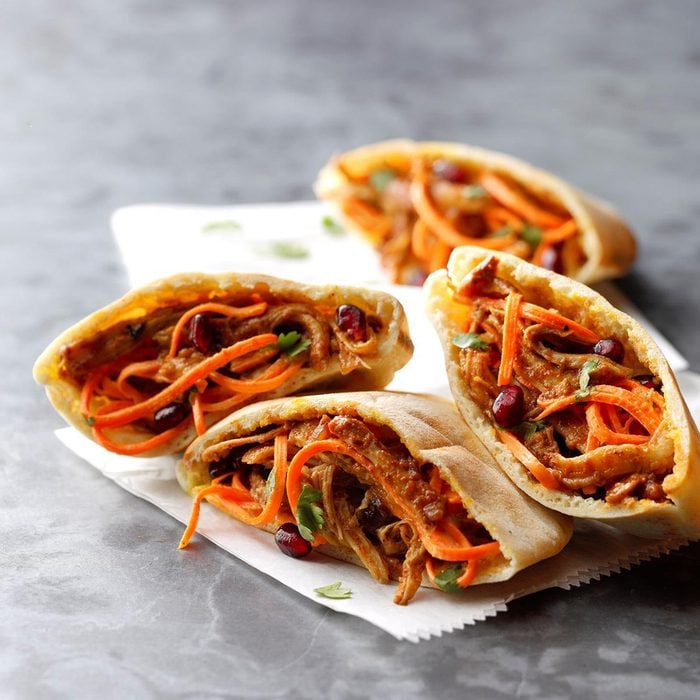 I enjoy shredded chicken dishes, pita sandwiches and Moroccan seasonings. The addition of the carrot salad laced pomegranate seeds and with dates lends an extra punch and crunch. Mini flour tortillas can be substituted for pitas. —Arlene Erlbach, Morton Grove, Illinois