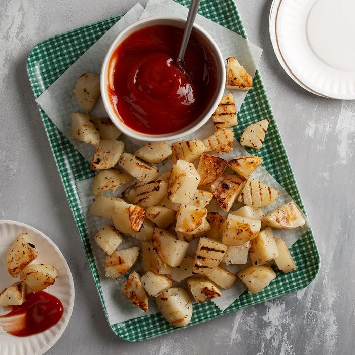 Need a simple sidekick to serve with steaks or chops? Try these grilled potatoes, which are bursting with fresh flavor. I make this recipe for picnics and potlucks. The potatoes turn out tender and well-seasoned. Plus, there’s one less pot to wash! —Jena Coffey, Rock Hill, Missouri