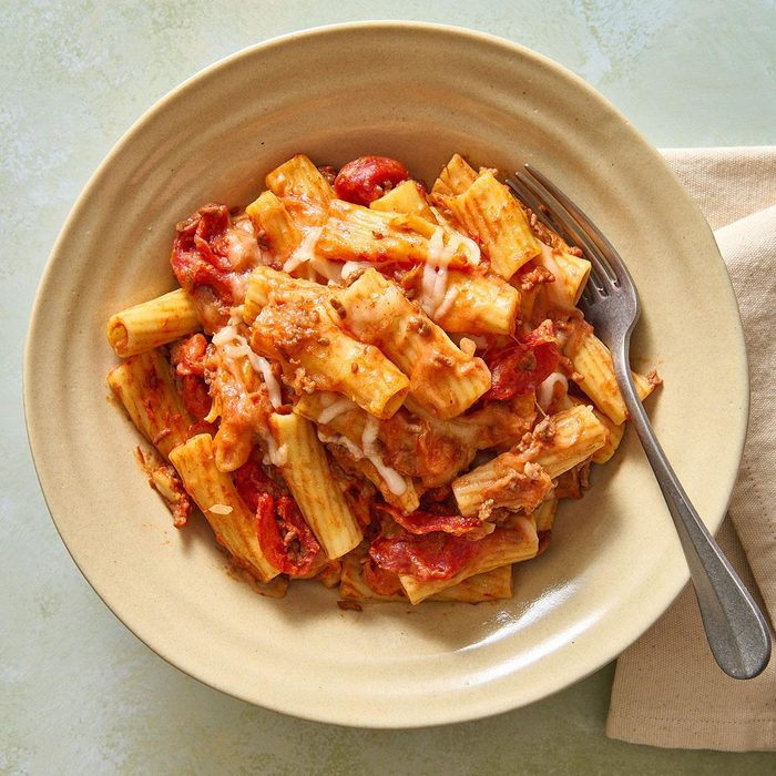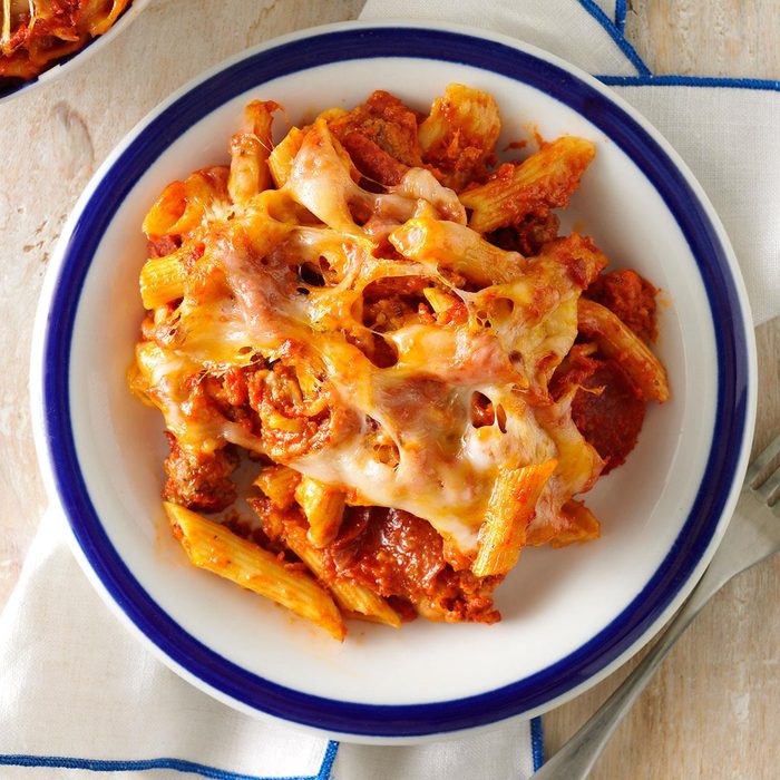 I make this hearty casserole for the men who help us out during harvesttime. Every year they say it’s the best—hands down. Throw in any pizza toppings your family likes—Canadian bacon, black olives and green peppers are some of our picks. —Brook Bothun, Canby, Minnesota
