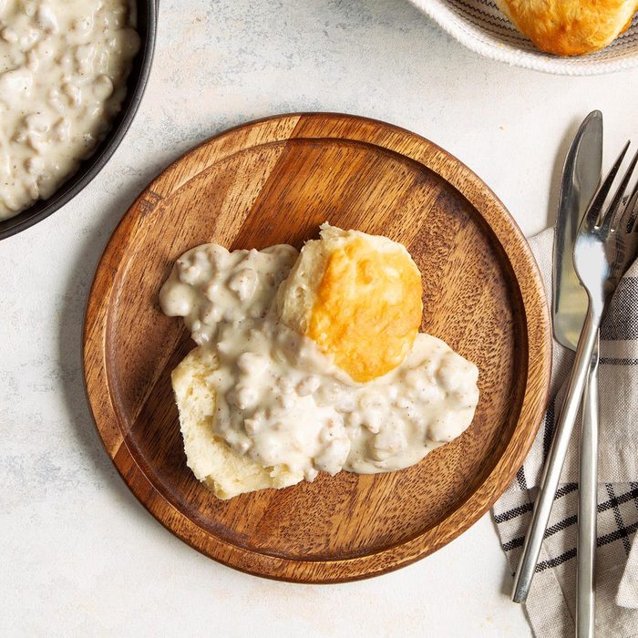 This biscuits and sausage gravy is an old southern recipe that I've adapted. Homemade sausage gravy is a classic, hearty breakfast that takes you on a trip to the South every time it's served. —Sue Baker, Jonesboro, Arkansas