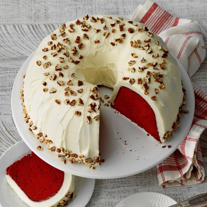This delicious red velvet pound cake is the perfect combination of flavors. Make sure the cake has cooled before icing it; for extra crunch sprinkle some roasted pecans on top. —Robin Smith, Old Fort, North Carolina
