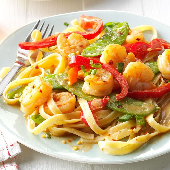 Peanut butter gives this tasty blend of red peppers, snow peas and shrimp its Thai flavor, while ginger and red pepper flakes spice it up. Serve this colorful main dish over pasta. —Jeanne Fisher, Simi Valley, California.