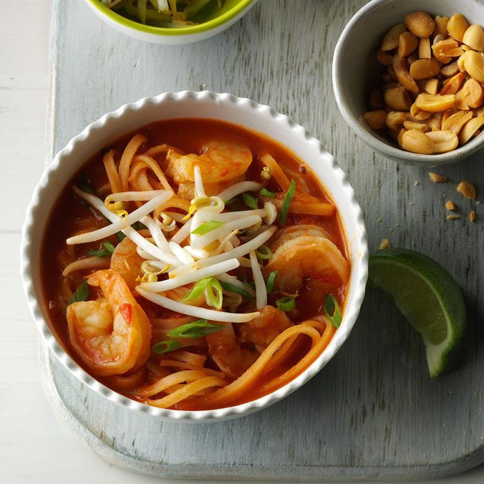 Pad thai is one of my favorite dishes, but it is often loaded with extra calories. This soup is a healthier option that has all the flavor of traditional versions. —Julie Merriman, Seattle, Washington.
