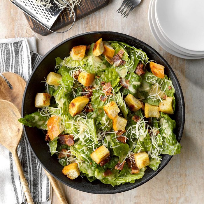 Bring the reliability and creaminess of a restaurant-quality Caesar salad to your table with a recipe that doesn’t complicate. With crispy bacon for a bit of texture and saltiness, even the salad skeptics at the table will dig in.