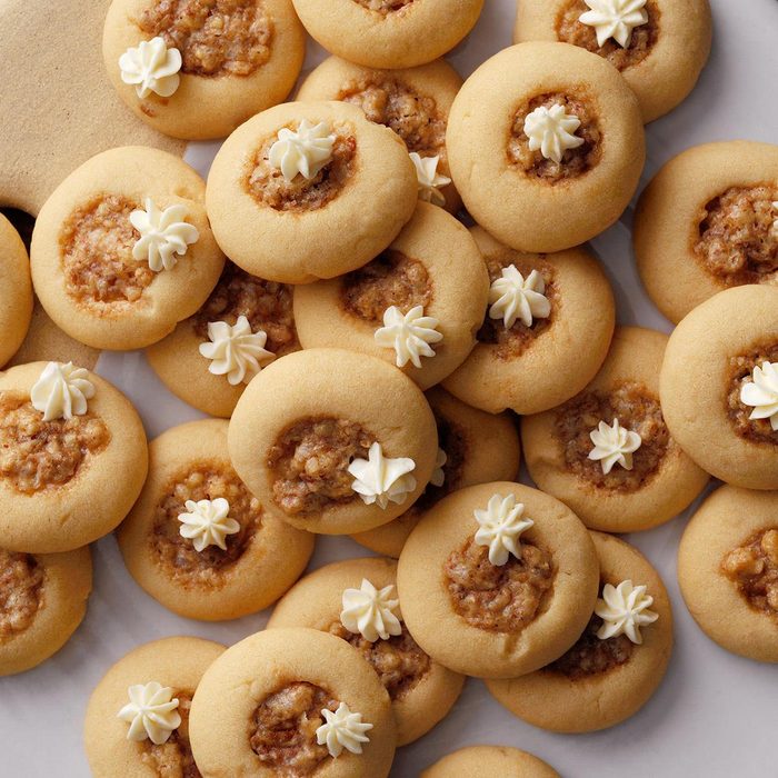 Give the classic fall dessert a twist with these pecan pie cookies. They’re a simple brown sugar cookie that’s topped with a gooey and crunchy filling and creamy frosting. You’ll want to make them every year.