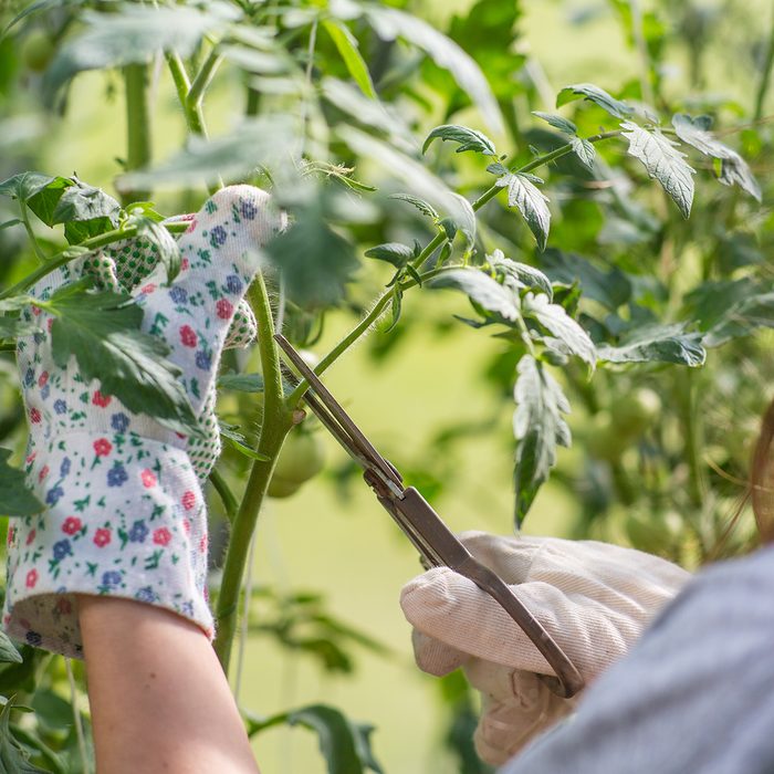 As the growing season comes to a close, trim off the very top of your tomato plant. This will encourage the plant to focus its energy on ripening up the last of the fruit on its limbs rather than growing taller. And if you still end up with a few green tomatoes at the end of the season, just use them in these green tomato recipes.