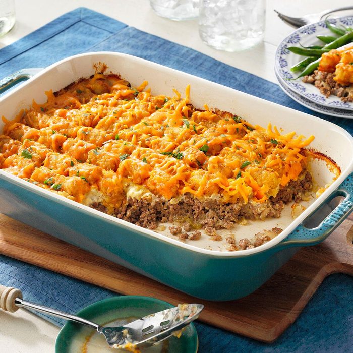 This casserole or, as Minnesotans like to call it, hot dish uses ground beef, mushroom soup, frozen Tater Tots and cheese for its charming taste. It’s a must-try Midwestern recipe that’s simple, easy and filling. —Taste of Home Test Kitchen