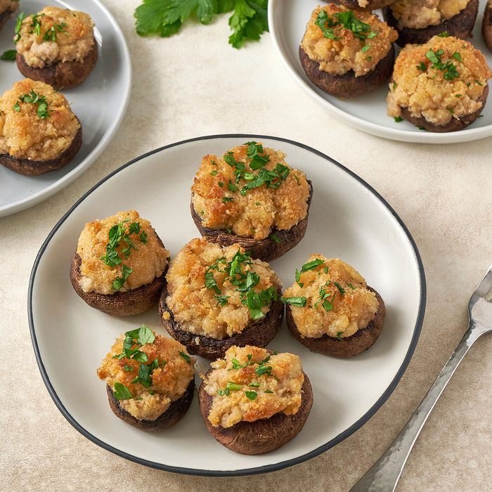 Crab, bread crumbs, Parmesan cheese, mayonnaise, garlic and fresh parsley are stuffed into fresh mushrooms and baked in the oven for 20 minutes. It’s such a delicious snack that you may want to serve it again for dinner.