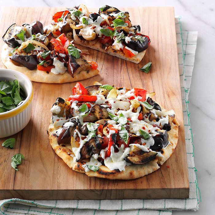 We grow eggplants and love to use them for our special pizza. Grilling adds robust flavor to the crust, veggies and garlic. Waiting for the eggplants to grow is the hardest part! —Judy Barrett, Chelsea, Alabama