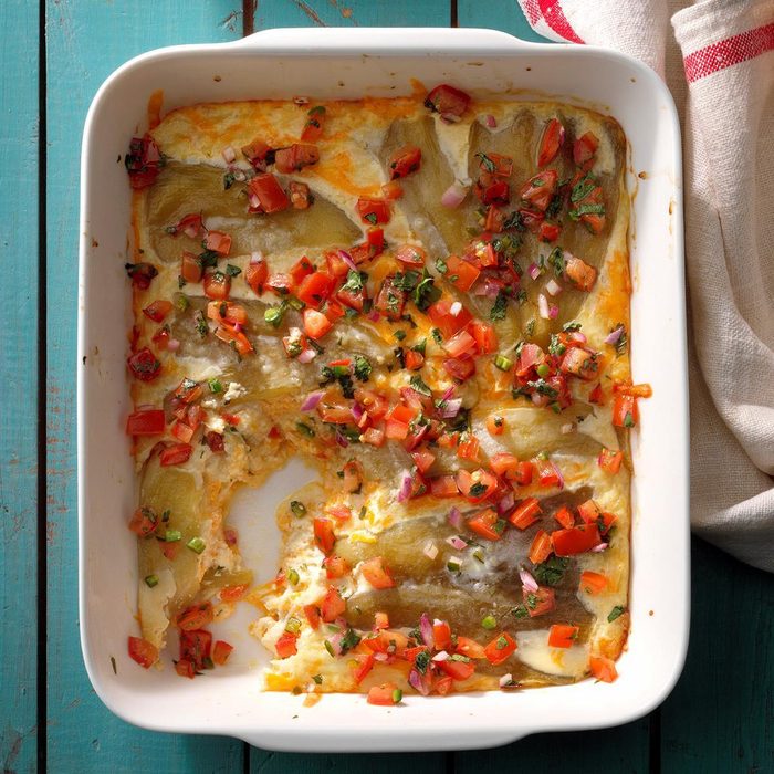 You won't bring home leftovers when you take these easy enchiladas to a potluck. With a homemade tomato sauce and cheesy filling, they always go fast. You can substitute any type of cheese you wish. —Ashley Schackow, Defiance, Ohio