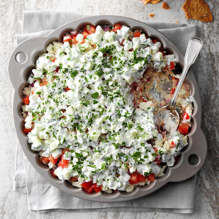 Not your ordinary layer dip, the bold combination of hummus and Greek yogurt will be a new most-requested recipe at your next baby shower or gathering. —Elizabeth Dumont, Boulder, Colorado