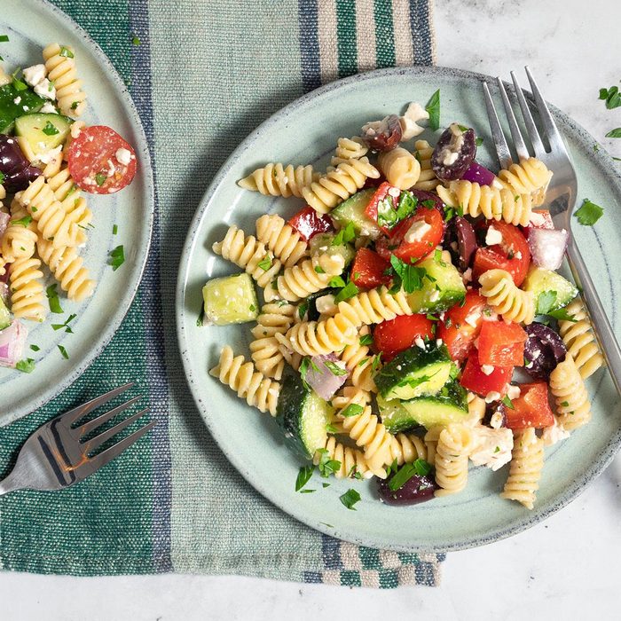 Take a refreshing, tangy Greek salad to the next level by adding hearty pasta to the mix. To increase the protein, try using gluten-free pasta made from lentils or chickpeas.