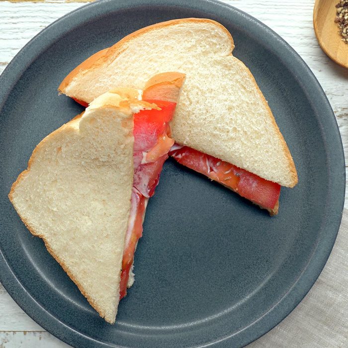 Tomato sandwiches are a southern delicacy, and ripe tomatoes are the star. Tomatoes are placed between two slices of white bread slathered in mayo to create a simple lunch that uses the bright flavors of the season. —Jenna Urben, McKinney, Texas