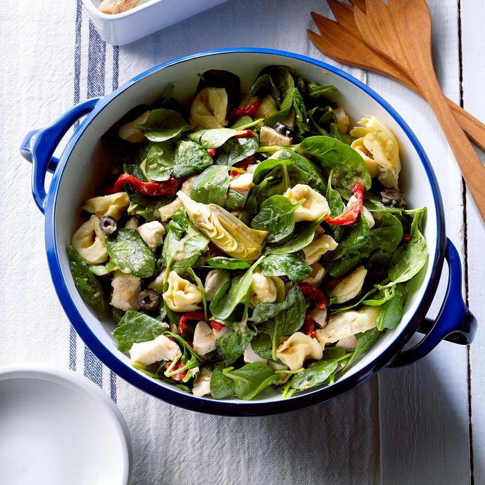 Spinach and tortellini go so well together, and this salad makes an easy meal with leftover cooked chicken. What really makes it special is the roasted onion that adds oomph to bottled salad dressing. —Robin Haas, Hyde Park, Massachusetts