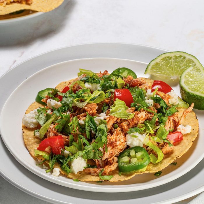 These flavorful tostadas are super easy and family friendly. You won't believe how tender and juicy the chicken comes out. Just load up the tostadas with your favorite fresh toppings, and you have one simple, sensational meal. —Lisa Kenny, Houston, Texas