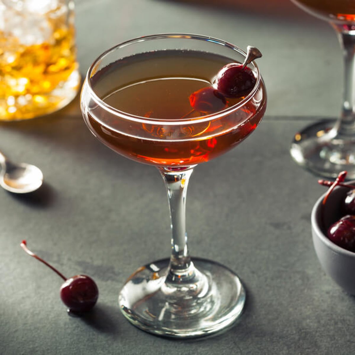 Whiskey combined with vermouth and a few dashes of bitters makes for a classic cocktail: the Manhattan. You can serve this drink in a short tumbler, but it always looks so elegant served up in a martini-style glass. Don’t forget the cherry!