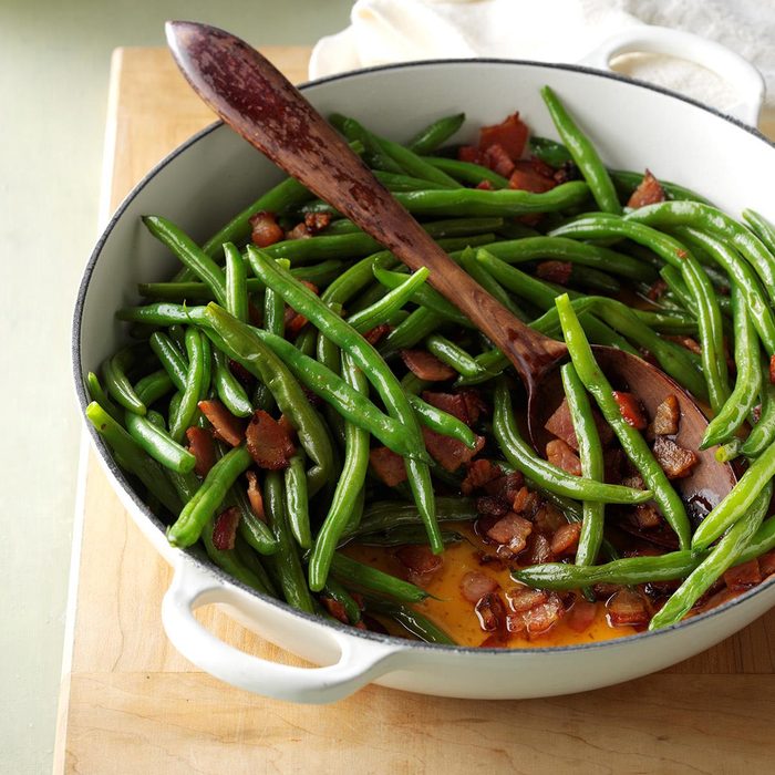 Mom would prepare home-grown green beans using this recipe, and boy did they ever taste good. The bacon provides rich flavor and the brown sugar adds a touch of sweetness. This is one irresistible side dish. —Willa Govoro, St. Clair, Missouri