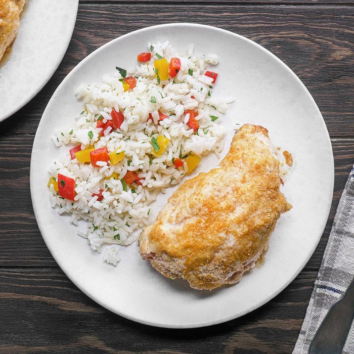 Layers of rolled ham and gooey cheese give this chicken cordon bleu an elegant appearance. It’s easier than it looks, too—it’s ready in under an hour.