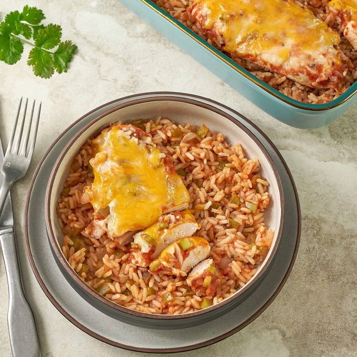 Arroz con pollo translates to “rice with chicken.” In this version, instant rice and boneless chicken breasts are baked in the oven with a robust tomato sauce.