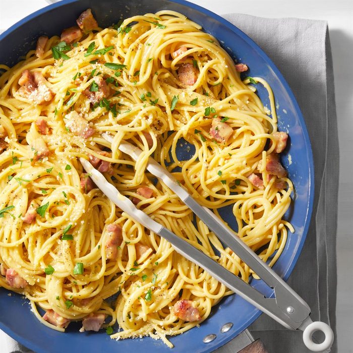 The smooth and creamy sauce in this carbonara is made with a simple yet indulgent sauce of eggs, cheese and cured pork. You can use bacon in place of pancetta if you don’t have any on hand.