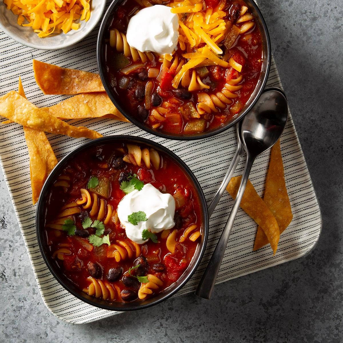 The fun, family-friendly twist in this taco soup is the spiral pasta. I lightened this soup by substituting black beans...