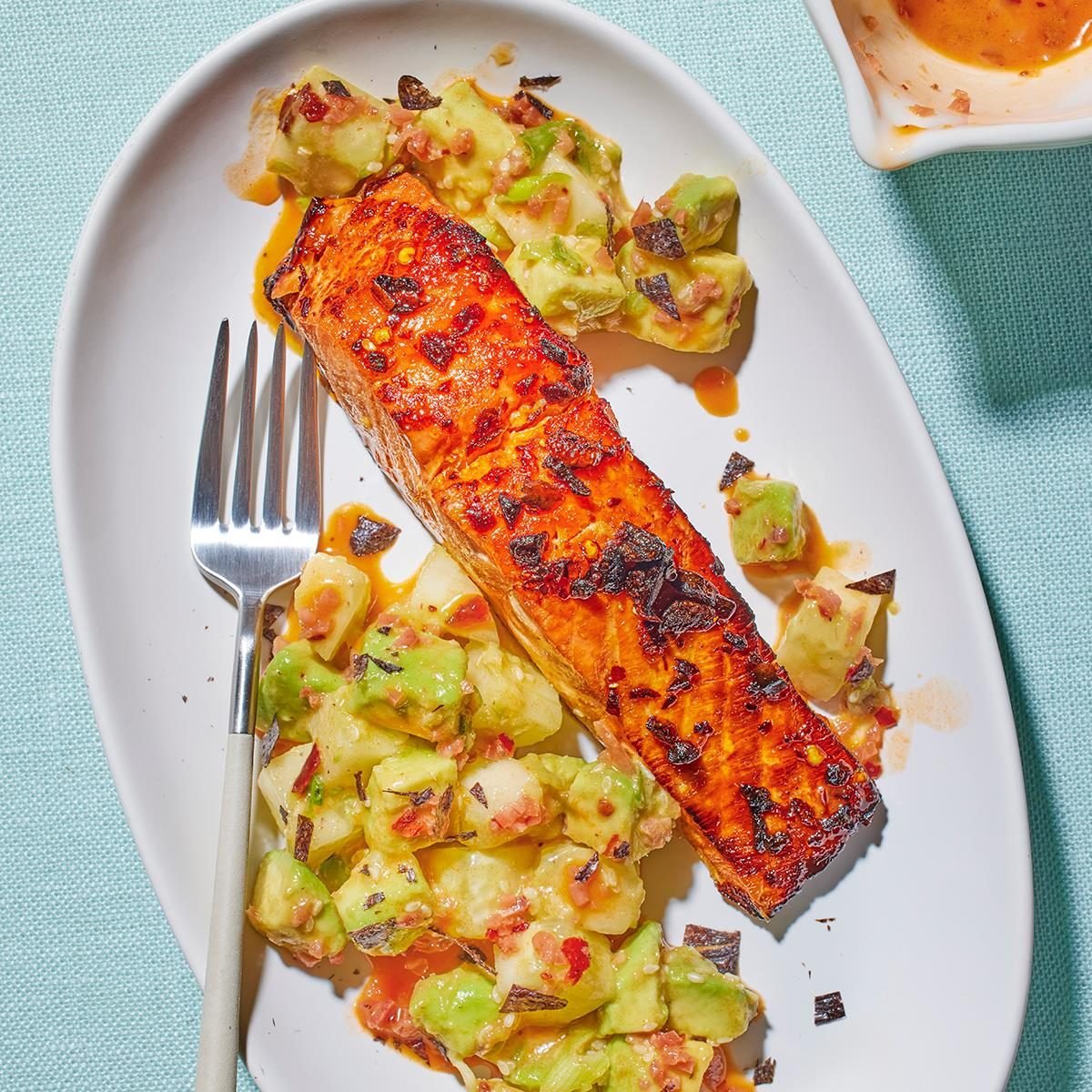 Chili Crisp Salmon with Avocado and Cucumber Salad