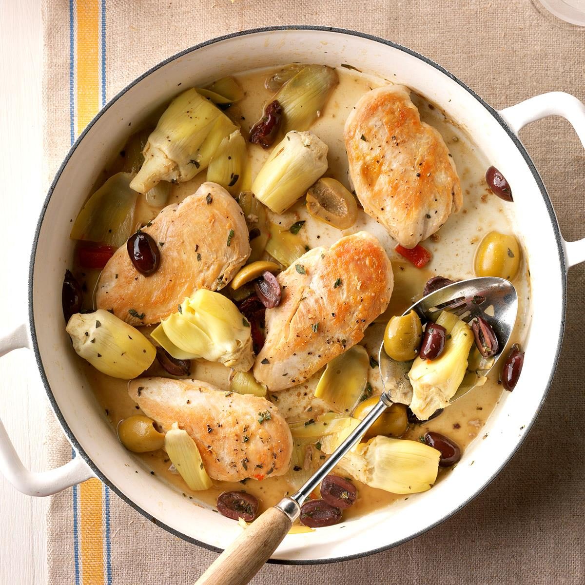 My fast chicken entree featuring artichokes and olives has real Greek flair. Seasoned with lemon juice and oregano, the stovetop...