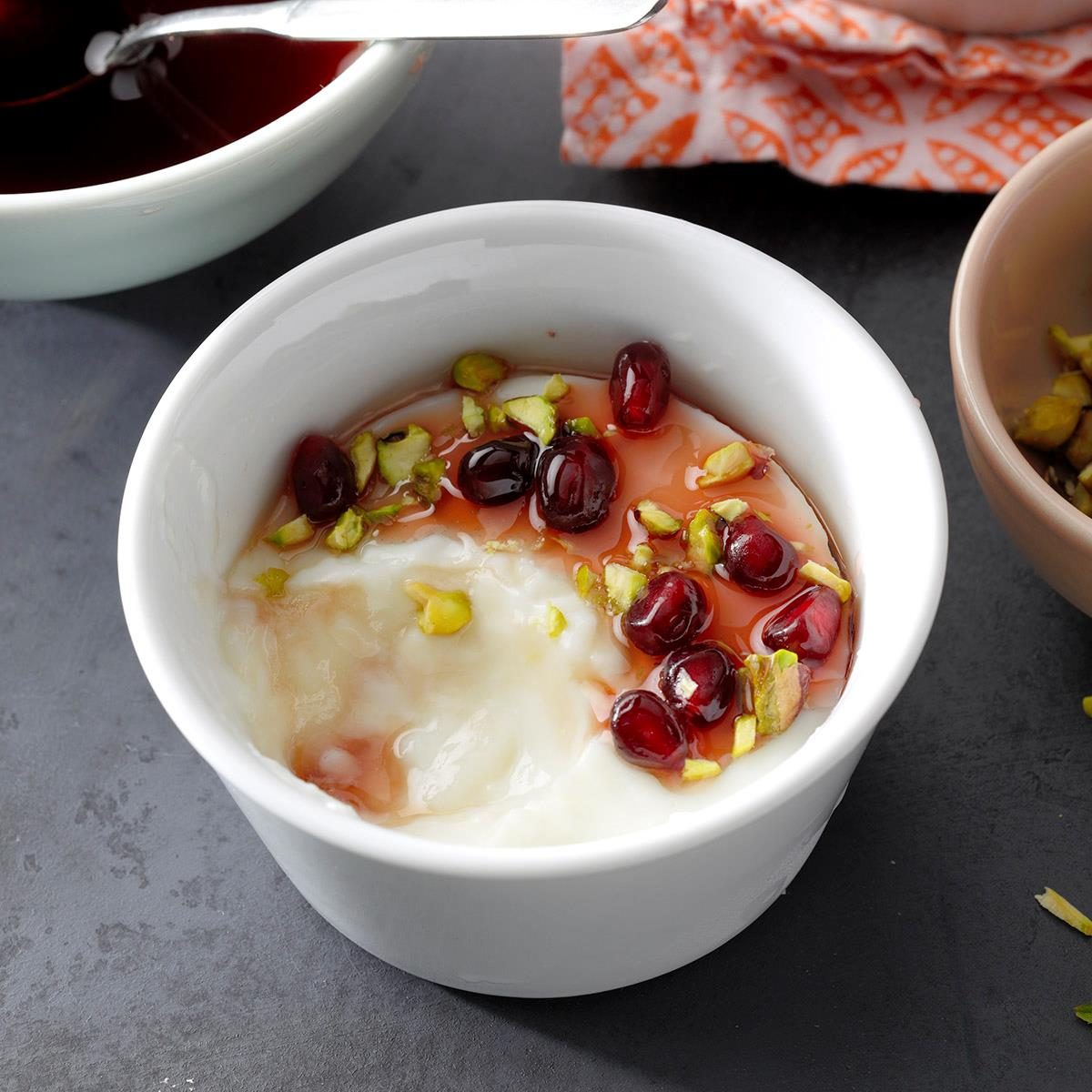 This rice pudding is a popular Middle Eastern treat. Pomegranate seeds and chopped pistachios add a simple yet elegant touch...