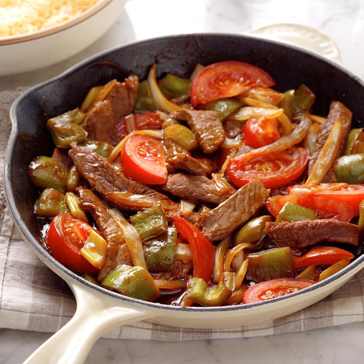 For a delicious, fast meal, try this flavorful beef dinner loaded with tomatoes and peppers. What a perfect recipe to use garden vegetables of the season! —Emmalee Thomas, Laddonia, Missouri