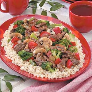 With tasty tender slices of beef and fresh colorful vegetables, this mouthwatering stir-fry was designated "a keeper" by my husband...