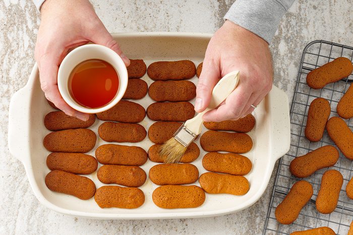 Next, grab a 13×9-inch pan and arrange ladyfingers in a single layer. You want to cover the bottom of the pan, so if there are any large gaps, you can break the cookies to fit (you won’t be able to tell with the finished product).