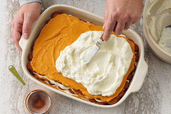Once the base is laid, top the ladyfingers with a third of the pumpkin filling and then a third of the cream cheese mixture. An offset spatula really helps here. With both layers of cream in place, repeat the process twice more: ladyfingers, rum, pumpkin and cream cheese.