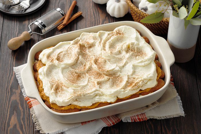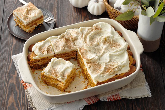 To store the tiramisu, cover and stash in the fridge. Try to eat it all (or hand out leftovers) within three to four days. If you know you can’t finish it all, you can freeze pumpkin tiramisu for up to three months. Just wrap the pan or individual pieces tightly, then thaw when you’re in the mood for a treat.